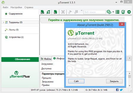 [c]  [/c] [b]µTorrent[/b] - достаточно мощный, бесплатный клиент сети BitTorrent, постоянно получающий наилучшие отзывы. Среди главных преимуществ µTorrent - впечатляющий (для малого размера программы) набор возможностей, стабильная работа, поддержка устаревшего «железа» и старых версий Windows. µTorrent создан так, чтобы он потреблял минимальные ресурсы системы, предоставляя при этом, широкие возможности даже по сравнению со значительно большими по размеру клиентами BitTorrent (например Vuze или BitComet). µTorrent представляет собой один-единственный исполняемый файл и при установке не меняет никаких настроек системы. [b]Основные характеристики µTorrent:[/b] — Ограничения максимал